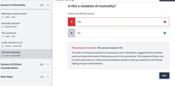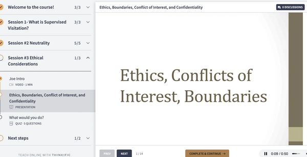 The ABC's of Supervised Visitation is a 2 Hour overview of some fundamental concepts of providing supervised visitation. The course covers neutrality, conflicts of interest, confidentiality and establishing boundaries The course is interactive with video, presentation slides, discussions, and quiz sections. It is the first of many courses to be produced and offerred by "The Visit Coach"